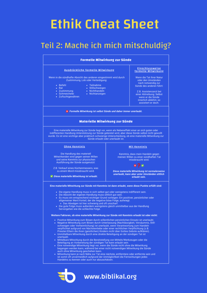 Biblikal.org hat einige kompakte Übersichten für Christen erstellt, sogenannte Cheat Sheets, die helfen sollen, einen schnellen Überblick über verschiedene Aspekte und Argumente zu einem Sachverhalt zu erlangen. Es folgen die Ethik Cheat Sheets: